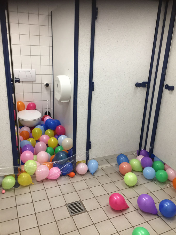 Überall liefen Menschen mit mit Lippenstift bemalten Wangen herum und wer nicht aufpasste, wurde von einer Wasserspritzpistole abgeschossen, die irgendwann auch in die Hände der Lehrer:innen gelangten.
