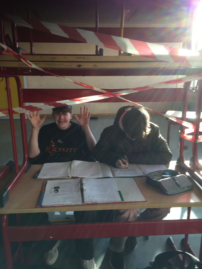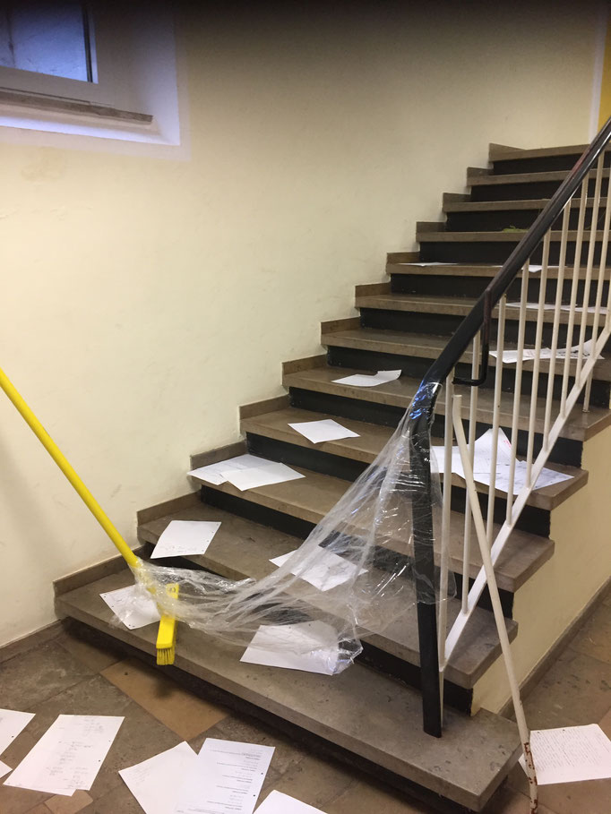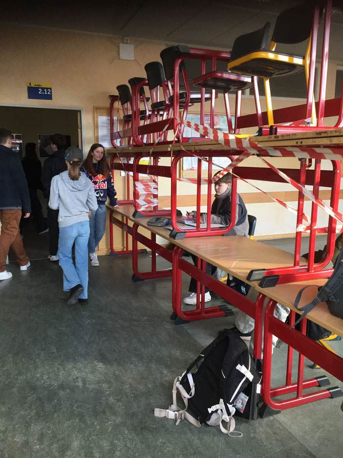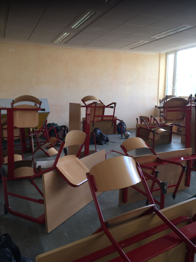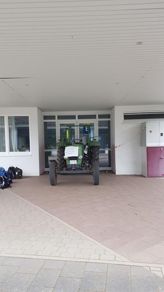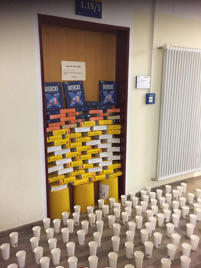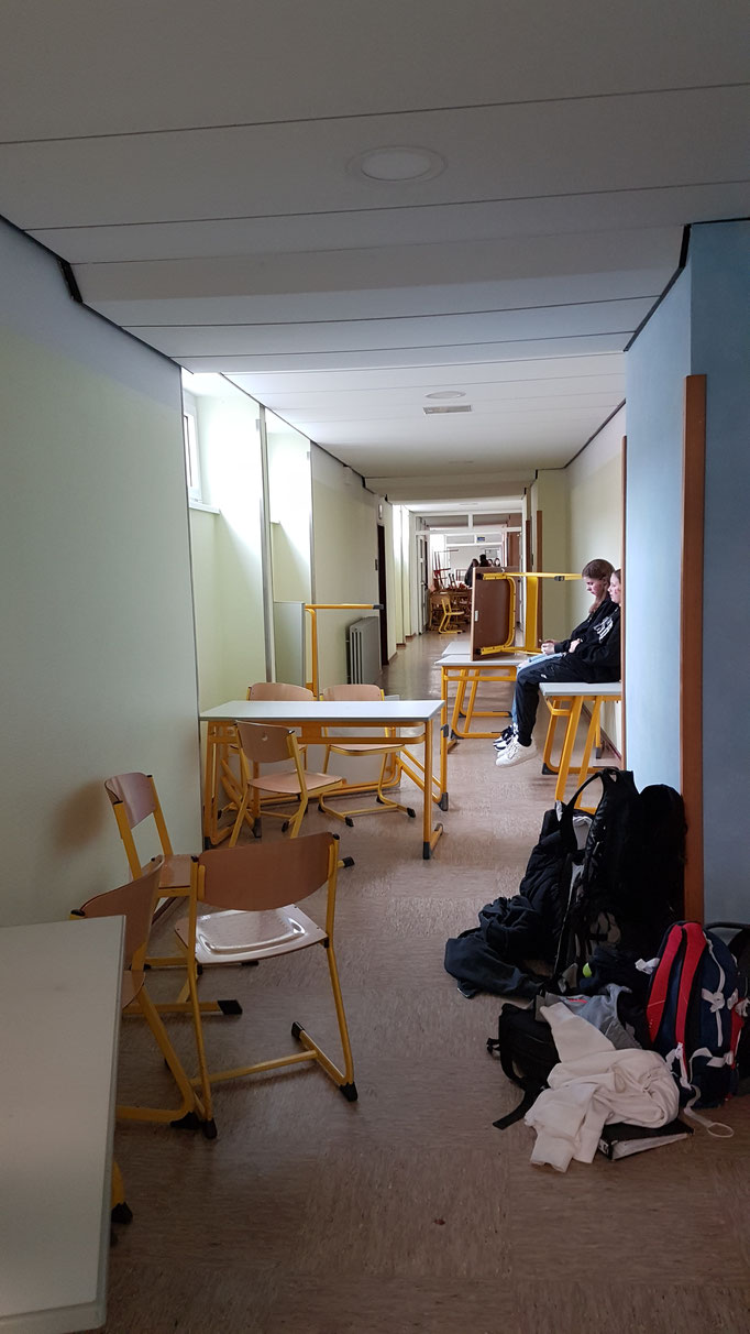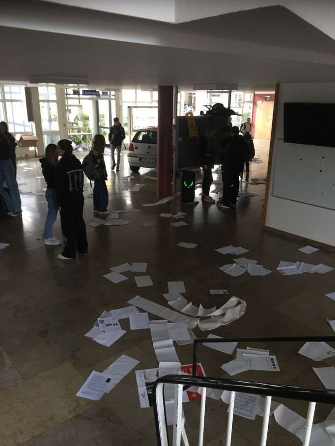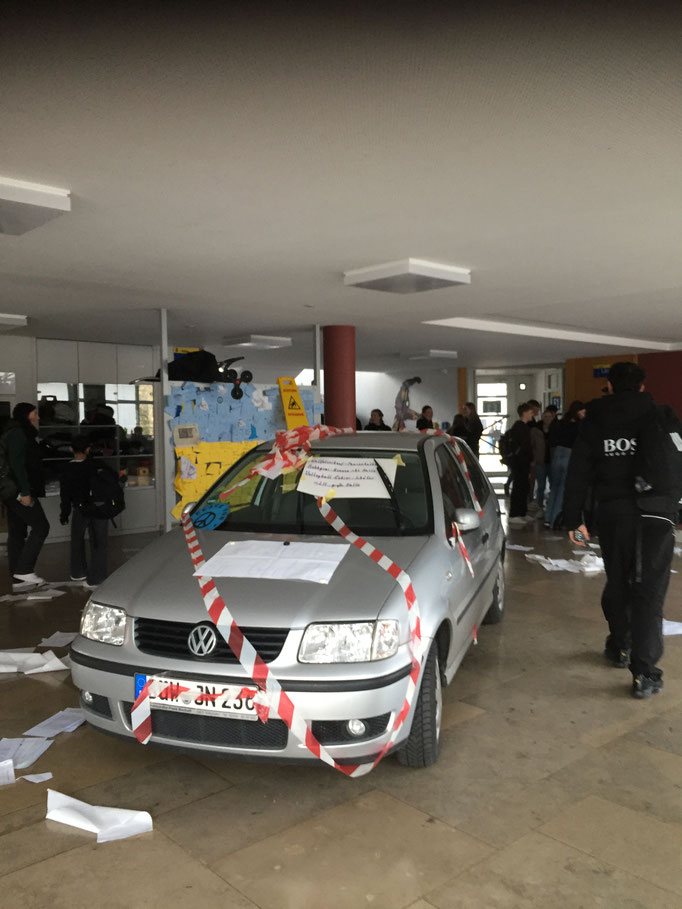 In der Pausenhalle stand (schon wieder) ein Auto, überall lagen alte Tests, Arbeitsblätter und Lernzettel auf dem Boden. Diese konnte man sich mitnehmen, wenn man schonmal für die Oberstufe lernen wollte oder die Noten von Leuten herausfinden wollte. Auch das Lehrerzimmer war wieder blockiert. Wer es über all die mit Wasser gefüllten Pappbecher schaffte, dem begegneten an der Tür zum Lehrerzimmer eine mit Duden und Atlanten blockierte Tür. Plakate wurden von den Wänden gerissen und oben im Gang war ein Labyrinth aus Stühlen und Tischen aufgebaut. Außerdem stand vor dem Neubau ein Traktor.