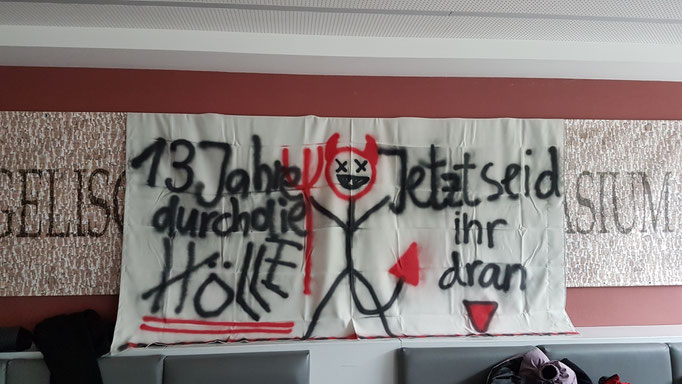 Nicht zu vergessen hing in der Pausenhalle ein riesiges Schild mit der Aufschrift "13 Jahre durch die Hölle - jetzt seid ihr dran!"