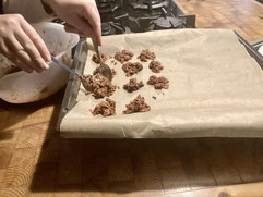 4. Anschließend legt ihr zwei Bleche mit Backpapier aus und formt dann mit zwei Löffeln kleine Häufchen aus dem Teig. Wenn ihr damit fertig seid, müsst ihr die Schokocrossis nur noch auskühlen lassen.
