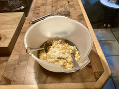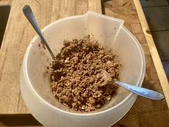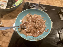 3. Gebt anschließend die geschmolzene Schokolade hinzu und rührt alles mit zwei Löffeln um.